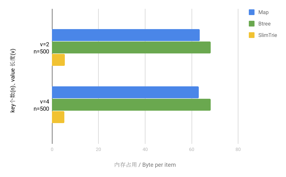 两者进行对比,可以明显看出,SlimTrie 所占用的空间额外开销仍然远远小于map 和B-Tree 所占的内存,每个key 能够节省大约50 Byte 。