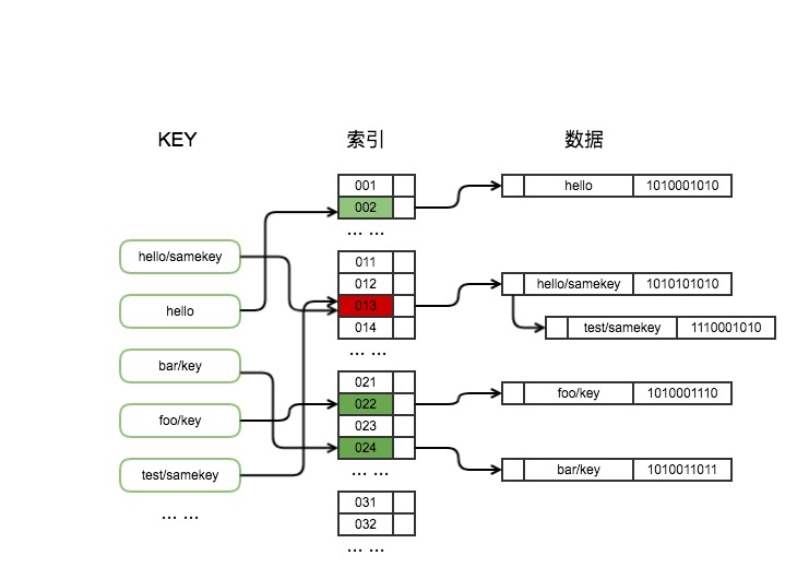 Hash map 类索引首先会利用hash 函数的计算,将要存储的key 映射到一个新的hash 值,然后再建立索引。查找定位时也需要这一步的计算来定位到真正数据存储的位置。上面的例图简单展示了其结构和工作原理。