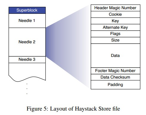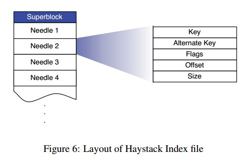 - Tip: 类Haystack 的设计在对象存储中很常见: Haystack 是一个关于单机存储设计的实现, 为了提升IO 性能, 降低文件系统Inode 的读写开销, 将小文件合并成一个大文件存储, 并在内存中存储所有文件的元信息(meta), 这样直接将每个文件读取的2 次IO(inode+data)转变成一次内存操作和一次IO 操作.