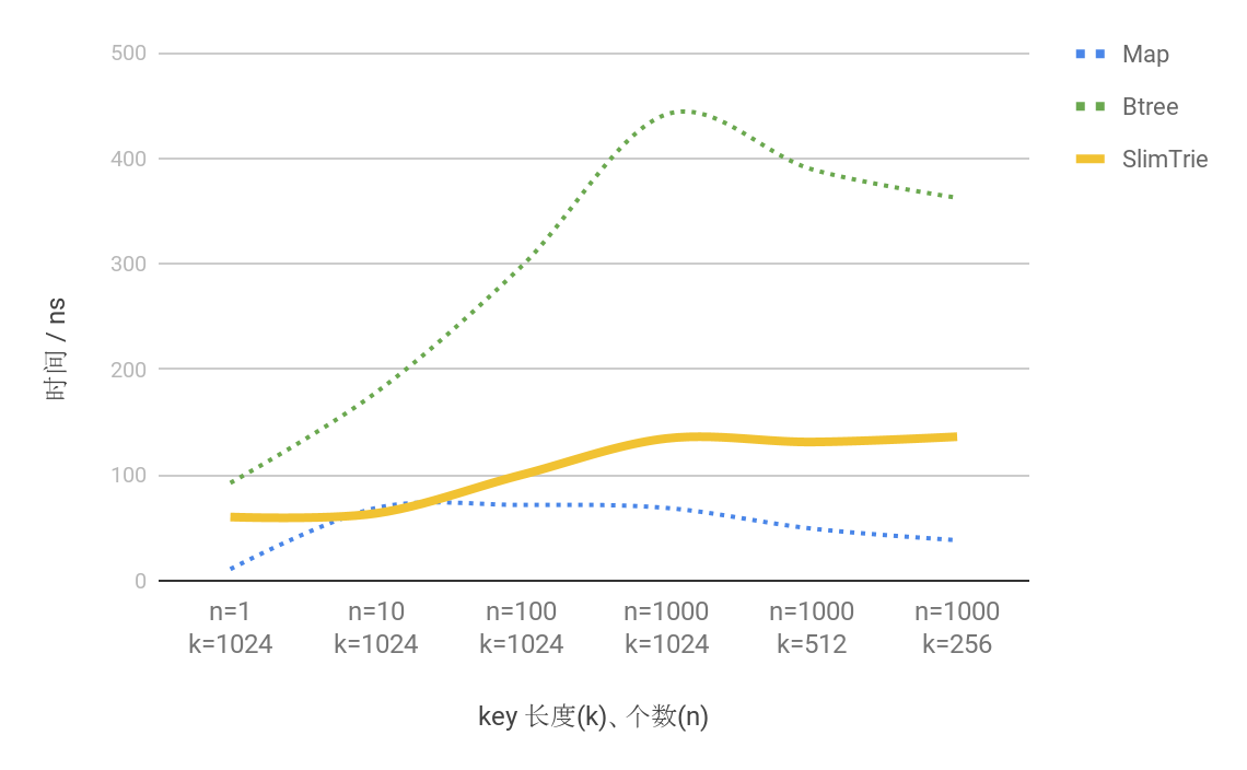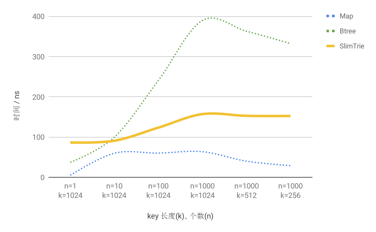 - 上面两个图中,前半段key 的长度k=1000 保持不变,随着key 的个数n 的增长,SlimTrie 查询耗时随之上涨;